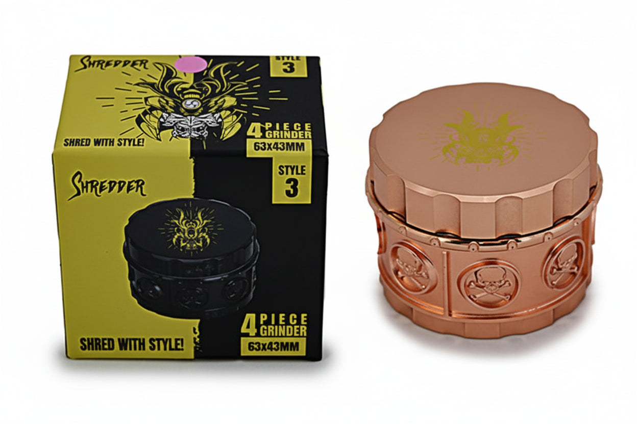The Style "3" 4-piece Shredder grinder measures 63x43mm, offering precise and efficient grinding performance. Its four-piece design includes a grinding chamber, collection chamber, and a fine mesh screen for optimal material separation. Crafted for durability and smooth operation, this unit provides consistent results for expert users seeking reliable and efficient grinding.