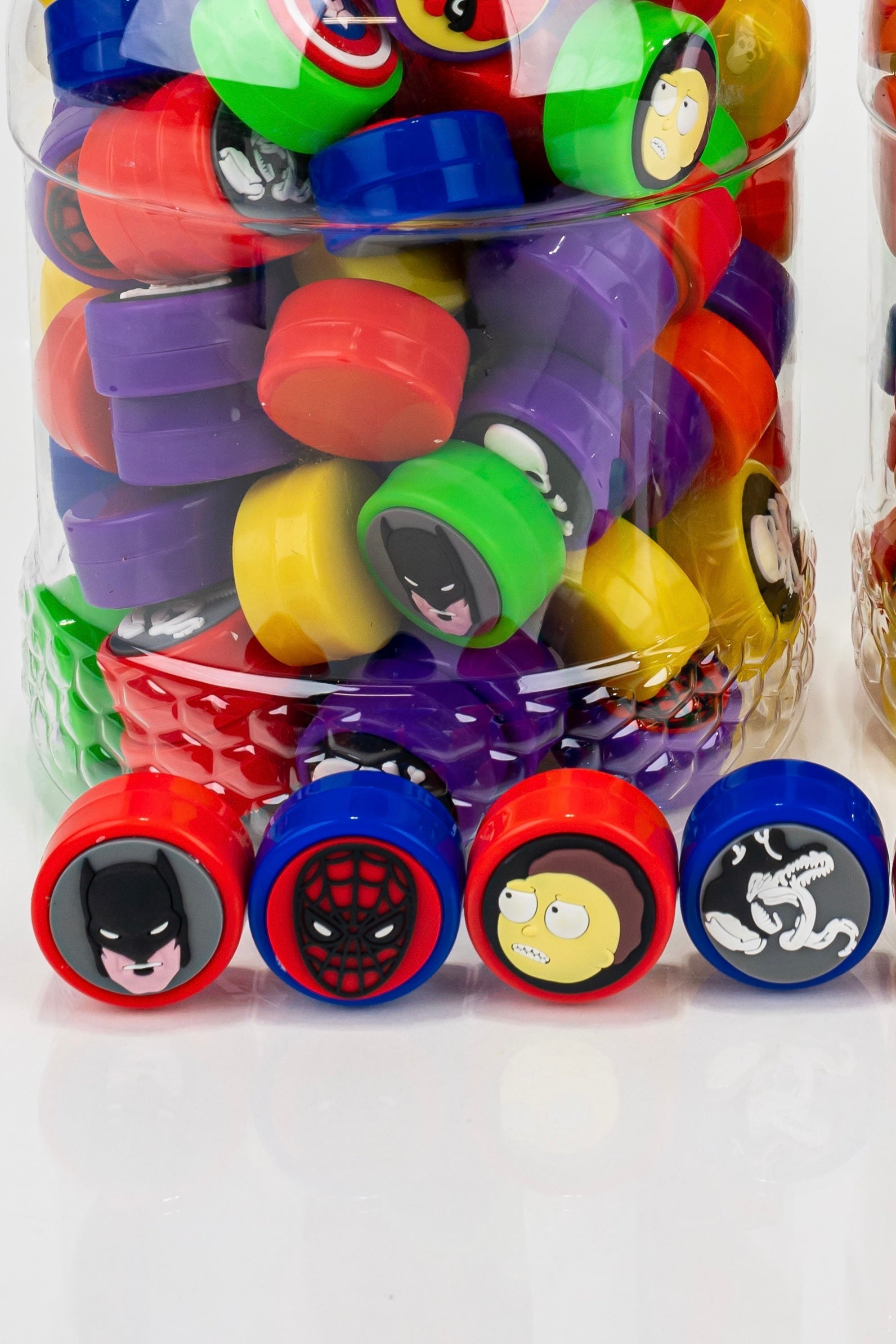 The WAX CONTAINER JAR features a marvel series design and glass bottom, along with a siplicone top for secure containment. 100 jars in a single box, making them easily accessible for storage and transport.